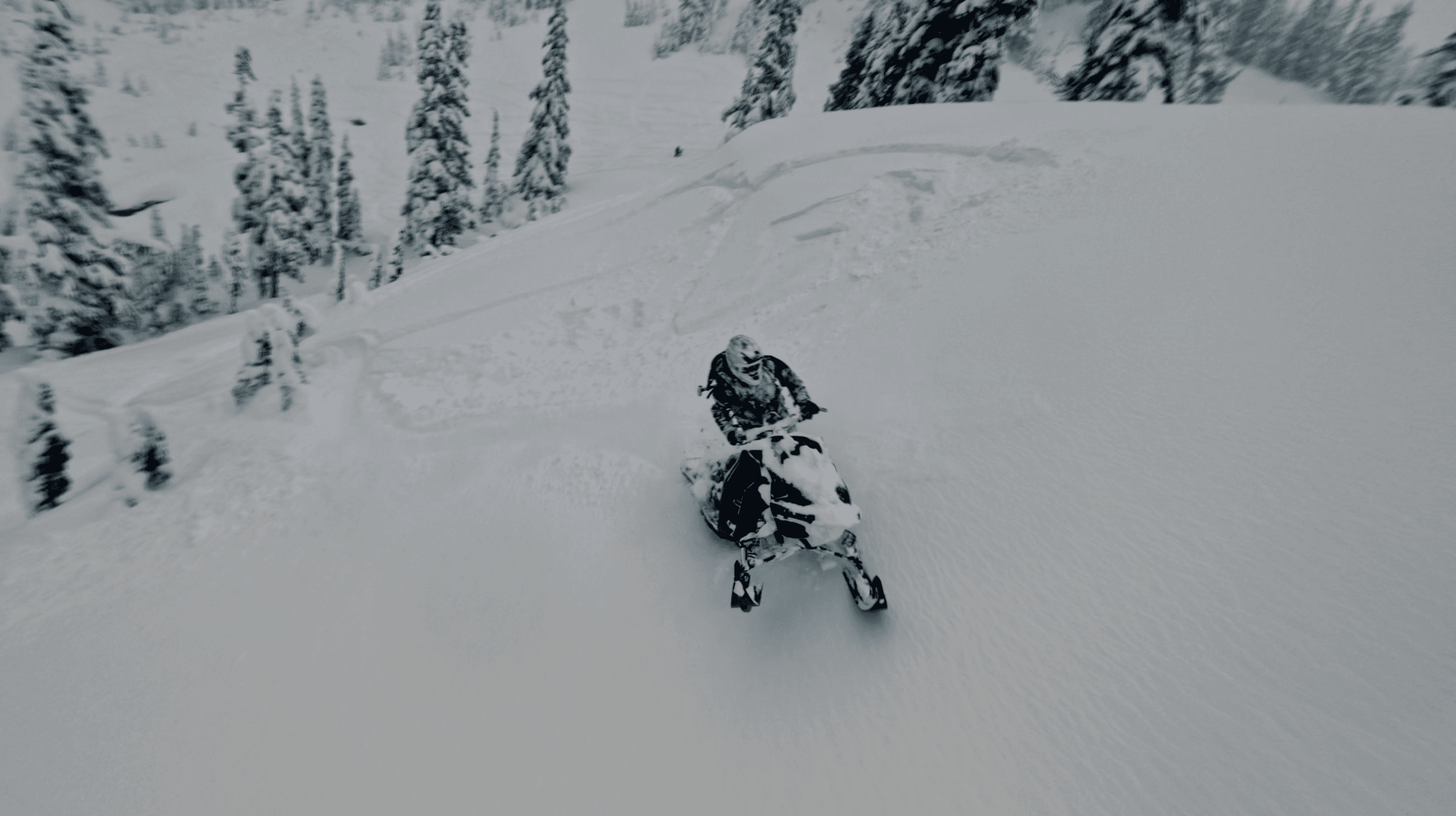 Highlight footage of athletes riding deep backcountry snow in the Sea to Sky Corridor. Emphasizing the close proximity capabilities of FPV drones navigating angles that would not be attainable otherwise.